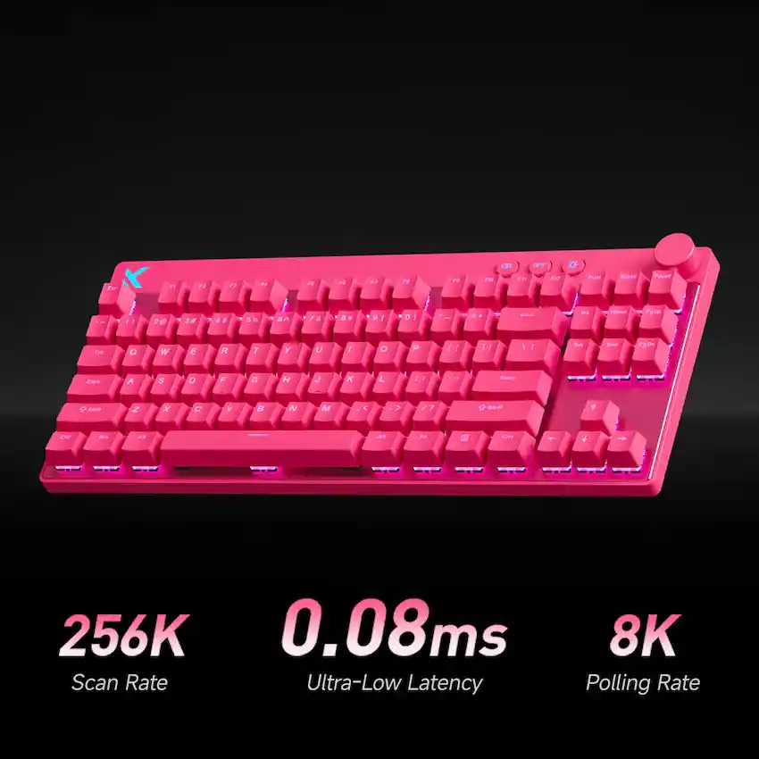 Bàn phím cơ MCHOSE Mix 87 Rose Red là mẫu bàn phím trang bị công nghệ Hall Effect (switch từ tính) cùng Apollo Magnetic Switch, mang lại khả năng phản hồi siêu nhanh với polling rate lên đến 8000Hz và độ trễ cực thấp chỉ khoảng 0.08ms, giúp từng thao tác luôn đi trước đối thủ một nhịp. Mix 87 còn cho phép tùy chỉnh hành trình phím linh hoạt từ 0.1 – 3.4mm với độ chính xác cực cao, tối ưu hoàn hảo cho các tựa game FPS, MOBA yêu cầu phản xạ tức thì.