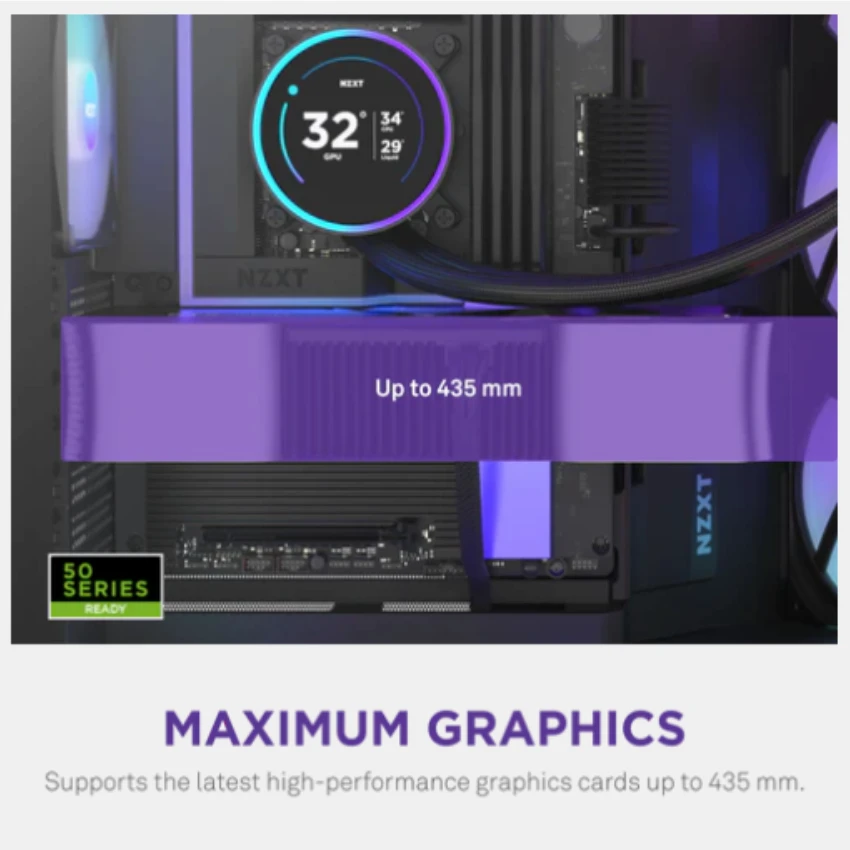 - Tản nhiệt và GPU cỡ lớn : Có thể lắp đặt tản nhiệt lên đến 420mm ở phía trên và phía trước bên phải, với khoảng không gian rộng rãi cho các card đồ họa cao cấp.